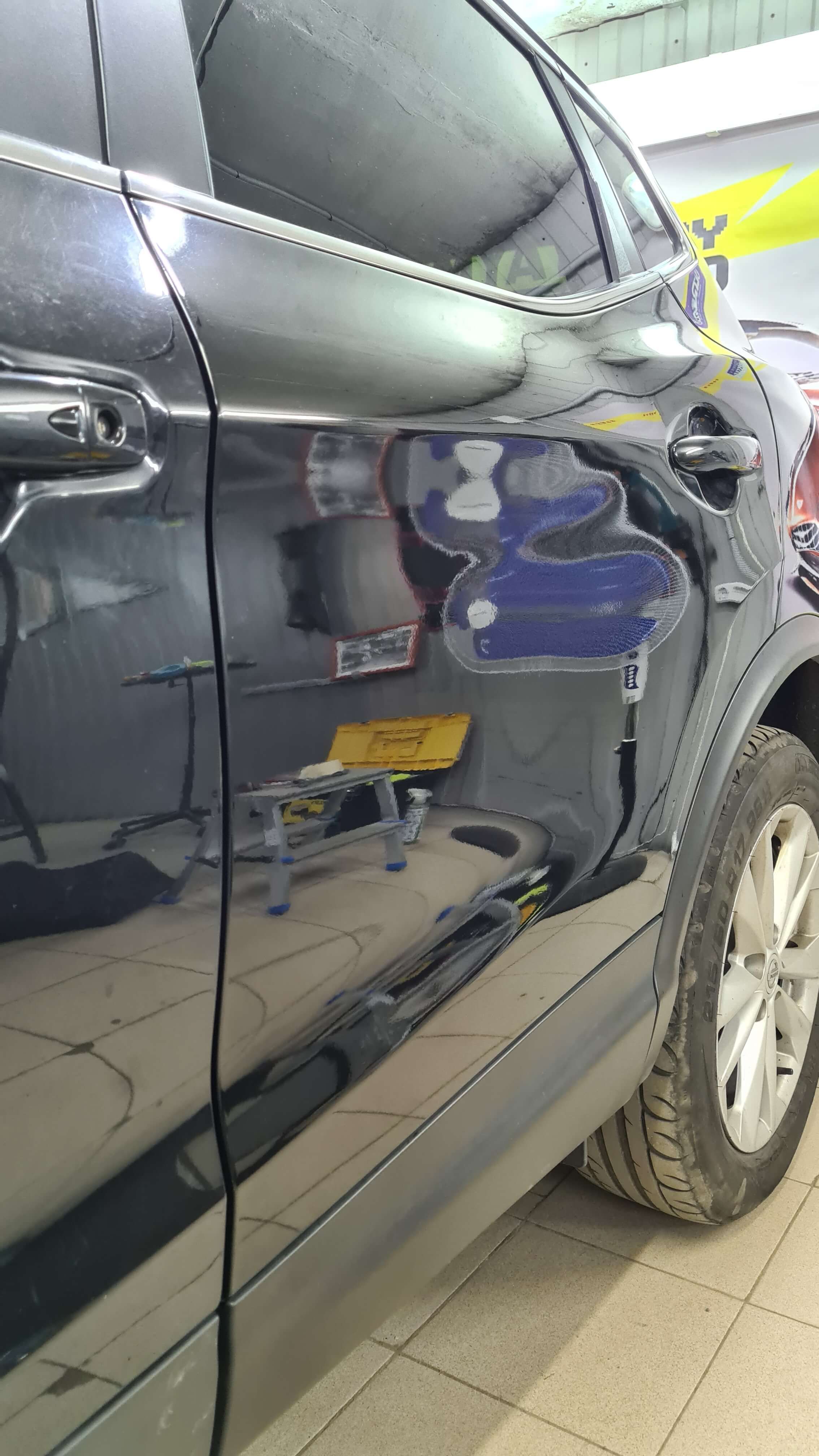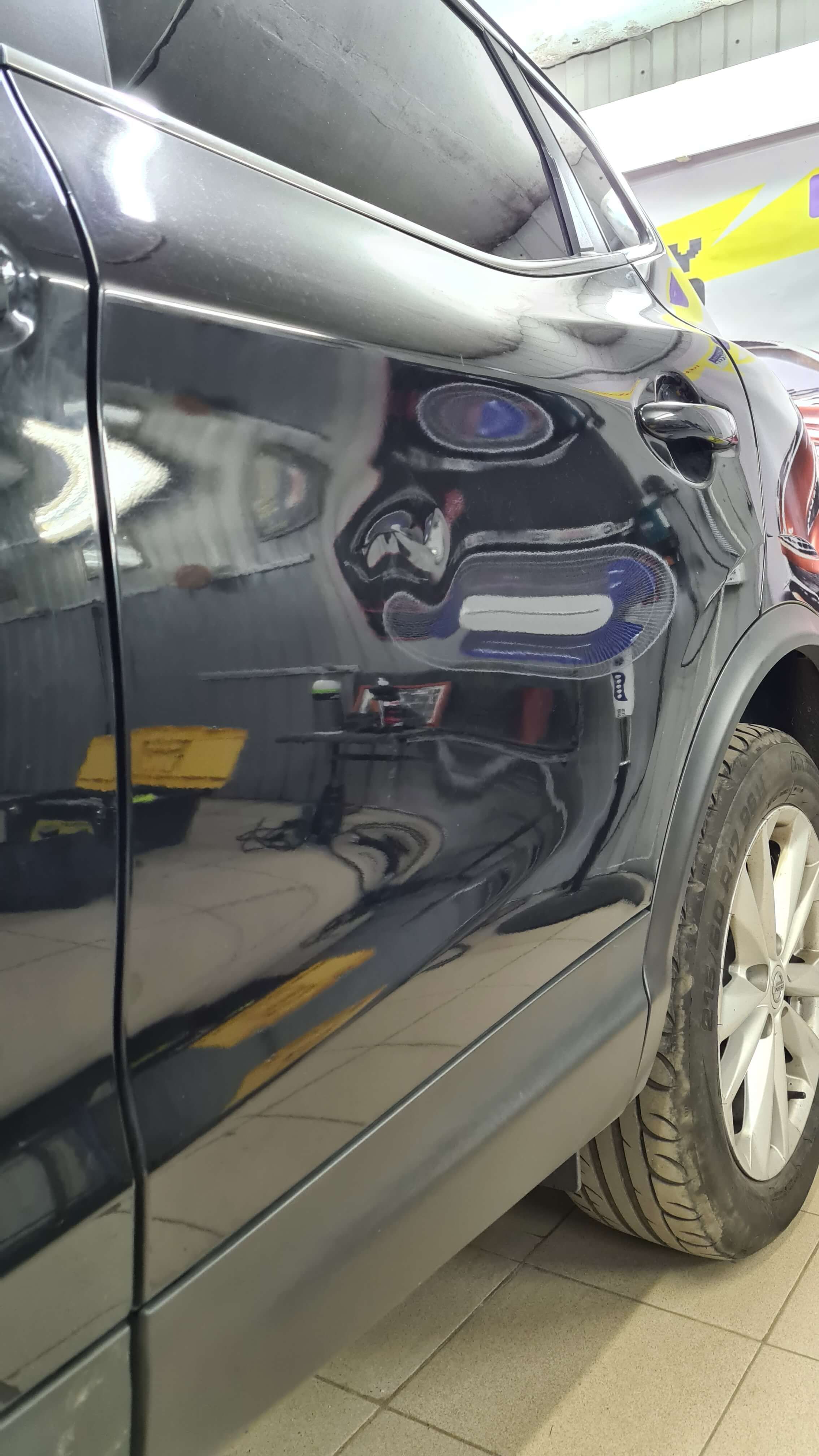 Очень сложный ремонт вмятины с сильным растяжением в районе усилителя был выполнен БЕЗ покраски